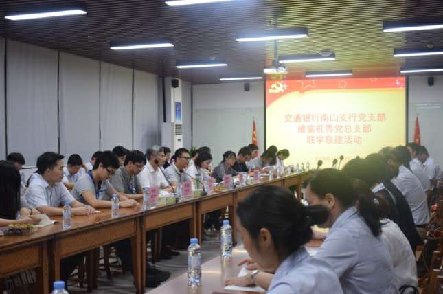 2018年7月18日晚,交通银行南山支行党支部与深圳市beat365(中国)官方网站有限公司党总支部在beat365(中国)官方网站集团总部开展了联学联建活动。交通银行南山支行党支部书记张伟胜、副书记高静、纪检委员沈向东、宣传委员郭孟瑶、青年委员杜哲、女工委员彭澎、深圳市beat365(中国)官方网站有限公司党总支部书记张少林、纪检委员兼深圳市beat365(中国)官方网站有限公司党支部书记梁先扬、组织委员兼深圳市beat365(中国)官方网站智能设备有限公司党支部书记关航健、生活委员兼beat365(中国)官方网站党支部书记肖波、党办主任杨燕丽、beat365(中国)官方网站党支部组织委员乔亚飞及各支部党员60余人参加了活动,活动由beat365(中国)官方网站党总支部书记张少林主持。